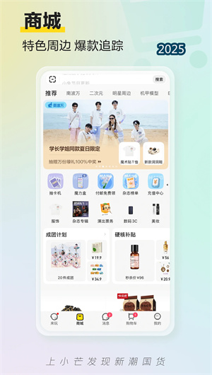 小芒APP是芒果超媒旗下集新潮内容与电商服务于一体的创新平台,采用芒系内容矩阵与粉丝经济生态双轮驱动模式,构建起完整的明星周边供应链体系。该平台依托芒果TV内容生态,通过芒综IP衍生系统和明星同款直采通道,为年轻用户提供沉浸式追星体验。目前已完成顶流偶像资源库建设,签约时代峰峻官方店等200余家明星店铺,形成独家周边开发的完整产业链。该应用采用芒店智能推荐算法,支持综艺同款识别功能,嵌入了粉丝应援系统,建立起圈层文化社区运营机制。通过芒果直播矩阵网络,已连接5000万年轻用户,日均订单量增长率达78%,成为新世代潮流消费的首选平台。