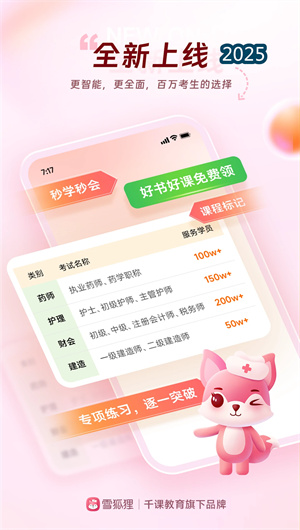 雪狐狸App是一款专注医护职称考试培训的专业教育平台,凭借行业优质的师资团队和独创的布盯教学法,为零基础学员构建高效学习体系。平台集名师直播、大数据题库、学习报告和晓得答疑等核心功能于一体,通过阶段性学习路径帮助学员快速搭建知识框架,利用碎片化时间实现系统化学习。经过十余年市场验证的教学理念,雪狐狸有效解决了传统医学教育中的痛点,使学员能够在短期内实现通关取证的目标,重新定义了医护考试培训的新标准。