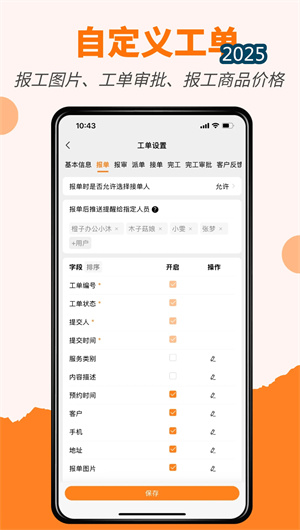 1. 橙子工单APP的核心功能体现在其灵活的工单自定义配置系统,企业可根据业务需求设置工单基础信息、抢单规则、报工审批流程和收费节点等参数。通过可视化流程设计器和规则引擎,管理员能够快速配置符合企业特色的工单模板,配合权限管理体系和角色配置功能,实现精细化的流程控制。该功能通过建立标准化作业流程和异常处理机制,使企业工单处理效率提升约58%,显著降低了运营管理成本。