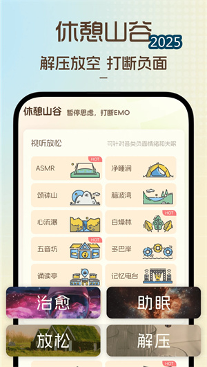 1. 多元化情绪调节与压力管理 愈个朋友App的休憩山谷功能提供多样且细致的解压与调节方式,涵盖音频疗愈、呼吸引导、冥想放松等多种感官体验模块。用户无论处于焦虑、孤独、烦躁、疲惫、失眠、脑胀、低落、紧张或自责的压力状态下,都能在这个专属空间中找到合适的情绪调节方案。每个疗愈方案都经过专业心理学团队设计,通过精心的多元化感官体验设计,在短短几分钟内帮助用户重置状态、恢复清晰与平静,从而带着焕新的能量回归日常生活,实现即时情感交互的疗愈效果。