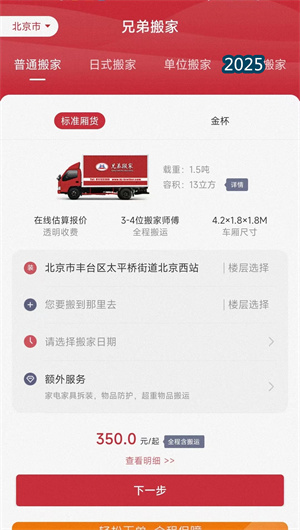 兄弟搬家App的在线估价工具采用参数化计价模型,用户输入物品数量、楼层信息、搬家距离等关键参数即可获得精准报价。系统内置的费用明细功能逐项展示人工费、运输费、材料费等构成要素,支持费用模拟与方案对比。创新的价格锁定机制确保签约后不加价,电子合同明确双方权责,配合全程费用监控,彻底杜绝传统搬家行业的坐地起价乱象,让用户享受完全透明的消费体验。