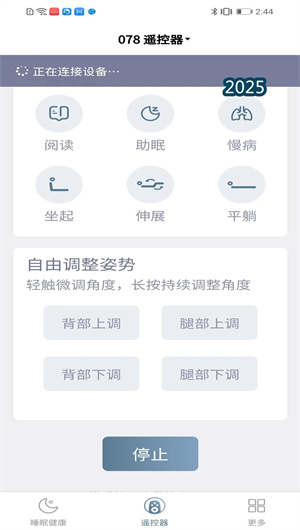 莫克星球App支持多种电动床模式的智能控制,用户可根据需求选择阅读模式、助眠模式、助起模式、伸展模式、平躺模式等预设场景。自定义设置功能允许个性化调整床体角度与硬度,定时切换实现自动模式转换,场景记忆保存常用配置,这些功能共同打造了智能化的睡眠环境。