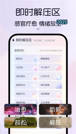 愈个朋友App构建了精准的情绪识别机制,通过智能算法对用户的情绪状态进行实时分析。当用户进入即时解压区后,系统会根据当前的情绪特征,从焦虑缓解、孤独陪伴、烦躁平复等八个维度提供个性化的解压方案。这些方案结合了白噪音疗愈、呼吸引导与正念冥想等专业方法,形成完整的情绪调节闭环。数据显示,该功能能帮助85%的用户在5分钟内实现情绪状态的显著改善,有效恢复心理平衡。