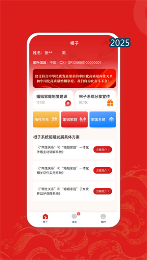 根子App是一款基于婚姻家庭制度建设中国化改革理念开发的数字化平台,以华夏文明为核心价值观,致力于重构当代两性关系与家庭伦理体系。该平台通过家国思想传承系统和伦理道德重塑机制,构建完整的共生体发展模型,推动精神文明建设与物质文明建设的协调发展。根子系统以民族精神凝聚为核心使命,通过数字化改革手段,为生育问题的解决和经济发展的推动提供文化基础,成为新时代家庭建设的重要工具。