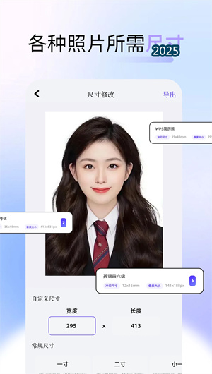 3. 规格适配引擎 改图呀开发了智能的证件照规格检测系统,能够自动识别照片的尺寸合规性、背景色值、头部比例等关键参数。通过一键校正快速调整不合格要素,利用标准比对确保输出照片完全符合官方要求,避免因格式问题导致的重复拍摄。