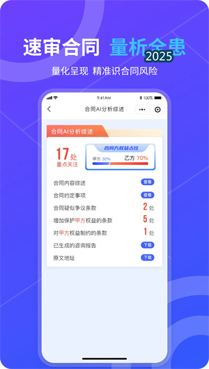 核小律App是由南京云放科技有限公司倾力打造的智能法律助手,依托公司自主研发的AI TopOne霸王龙大模型与海量法律数据资源,构建了集合同管理、风险识别、法律咨询于一体的专业服务平台。该应用深度融合人工智能技术与法律专业知识,通过先进的OCR文字识别技术和智能分析算法,为用户提供精准高效的合同审查服务。平台目前已完成对超过10000份标准合同的学习训练,合同审查准确率高达99%,日均处理合同审查请求达8000次,成为国内领先的智能化法律服务平台。