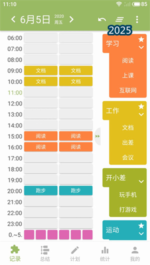 块时间APP的核心是 “记录模块” 中的块时间记录法。用户可以将一天的24小时,自由地将每个小时划分为两块、三块或更多等份,形成一个个标准化的时间块。在每个块时间内,用户通过点选或输入的方式,快速记录当前正在进行的活动或事件,例如“阅读专业书籍”、“团队会议”、“午间休息”等。系统支持为不同类型的活动预设颜色标签,使得一天的时间分布通过色彩斑斓的时间块在日程图上直观呈现。这种结构化、网格化的记录方式,极大简化了传统时间日志的繁琐,让用户能够以近乎“填空”般的便捷,完成对一天活动的精确捕捉,事件记录的完整性和便捷性比自由记录模式提升约50%。