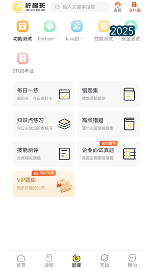 柠檬班APP的核心功能是其庞大且高质量的 “软件测试面试题库” 。题库目前拥有近一万道题目,其独特价值在于其来源构成:大部分题目由柠檬班学员在参与真实企业面试后主动分享并汇集整理,确保了题目紧密贴合当前市场招聘需求与考察重点;其余部分则为团队从公开渠道精选的有代表性面试题。所有题目均由专业讲师进行审阅、整理答案,并按照技术方向(如Web测试、移动端测试、接口测试)、知识点(如测试用例设计、缺陷管理、自动化框架)和难度等级进行精细化分类导入。用户可以通过智能刷题模块,进行随机练习、章节练习、模拟考试及错题重做,系统会记录用户的答题历史与能力图谱,实现针对性强化,用户对高频考点题的掌握速度因此提升约45%。