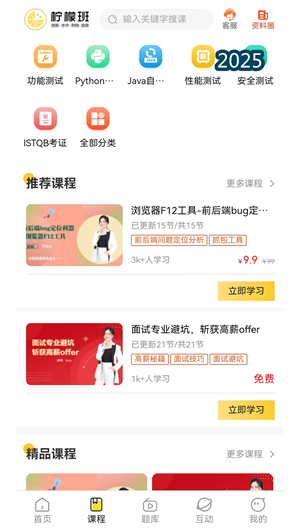 柠檬班APP在视频课程规划上,展现了 “纵向深入、横向覆盖”的全栈式特色。纵向而言,课程设计考虑了测试人员的完整职业发展路径:为新手提供扎实的功能测试入门;为寻求突破的工程师提供自动化测试与测试开发的进阶指南;为资深人士提供性能测试、大数据测试、安全测试等专项领域的深度探索;为走向管理岗位者提供管理类课程。横向而言,几乎涵盖了当下主流的、新兴的所有测试领域。这种全面而系统的课程布局,使得无论用户处于哪个职业阶段,都能在柠檬班APP找到适合自己的学习内容,实现一站式能力提升。