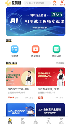 柠檬班APP是一款专为软件测试从业者及爱好者量身打造的专业化、一站式学习与成长平台。作为聚焦测试领域的垂直教育产品,本应用深度整合了学、练、测、问、交五大核心场景,旨在构建一个覆盖测试全职业生命周期的能力提升生态系统。柠檬班APP的核心内容源于一线实战与社区沉淀,其海量软件测试面试题库大多源自真实企业面试后学员的反馈搜集,并由专业讲师进行答案精校与体系化分类导入,确保了题源的实战性与时效性。同时,平台汇聚了由内部讲师精心录制上传的优质学习视频,内容覆盖从基础的功能测试到前沿的自动化测试、测试开发、性能测试、大数据测试、安全测试及测试管理等全技术栈。结合强大的社区互动专区,柠檬班APP不仅是一个知识仓库,更是一个连接测试人才、共享实战经验、追踪技术趋势的活力社区,是测试人员实现自我驱动式学习的必备工具。