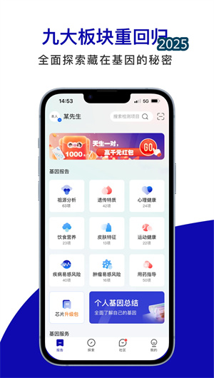 基因宝Genebox是一款集基因检测服务、数据解读与个性化健康管理于一体的专业移动应用平台。作为行业领先的基因检测App,基因宝致力于将前沿的基因组学研究成果转化为每个人触手可及的健康认知工具。平台基于先进的自研国产基因芯片技术,并与国家电网等战略伙伴合作,成功实现了核心技术的自主可控与成本优化,打破技术垄断,构建了涵盖测序仪、芯片、试剂、算法和软件的完整一体化平台。基因宝App提供包括祖源分析与健康检测在内的9大检测模块内容,覆盖遗传特质、心理健康、饮食营养、皮肤特征、运动健康、用药指导、疾病易感风险、肿瘤易感风险等关键维度,总计超过380+检测项目。平台秉持“服务永无止境”的理念,坚持每周持续更新新项目,每周四固定上新,确保用户能持续获得前沿的科学洞察。从线上下单、便捷的口腔拭子样本采集、App内一键免费回寄,到最终在基因宝App内查看详细报告,全流程体验流畅。在安全与信赖方面,平台拥有14项发明专利保护核心科研成果,并通过了严苛的国家信息系统安全三级认证,所有基因数据均受国家公安部监管,以最高标准守护用户隐私,持续提升服务质量。