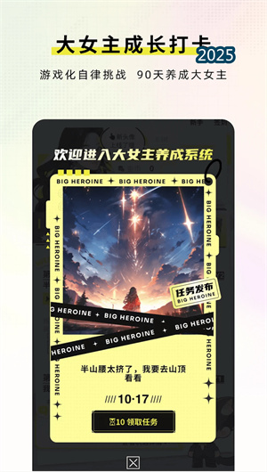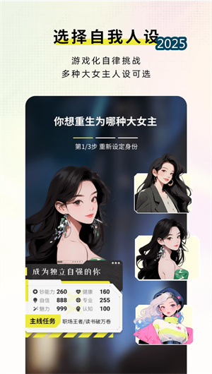 在当今追求个人成长与自我实现的时代背景下,我们创造性地推出了首款深度融合游戏化机制与自律养成体系的大女主成长打卡应用。本应用颠覆了传统打卡工具的单向记录模式,以前所未有的“人生游戏化”设计理念,构建了一个专为现代女性打造的沉浸式个人成长宇宙。我们将角色养成系统、行为动力学模型与成长型思维训练有机结合,通过数字化自我镜像技术,让每位用户都能在虚拟世界中映射并塑造理想的自我。该平台以叙事性任务链为核心驱动,结合个性化成长路径算法,为每位用户生成独一无二的人生主线剧情。在这里,成长不再是一句口号,而是一场可量化、可交互、可持续演进的生命体验,真正实现“养成你自己”的终极目标。