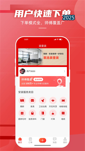 装壹装APP是一家专业从事工装上门服务的数字化平台,致力于构建连接广大消费者与专业工装师傅的一站式工装服务生态系统。平台以推动工装服务发展标准化为核心使命,通过整合维修、安装、测量等核心业务,为消费者提供便捷、可靠的下单找师傅渠道,同时为具备专业技能的师傅开放入驻自由接单的灵活就业机会。我们以 “品质好、安全好” 为双重基石,建立从资质审核、服务定价、流程监管到售后保障的全链路标准化体系,旨在彻底改善传统工装市场信息不对称、服务不规范、质量难保障的痛点,重塑工装消费服务体验。目前,平台已覆盖全国200+ 城市,认证入驻师傅超20万名,累计完单量突破500万,用户满意度持续提升。