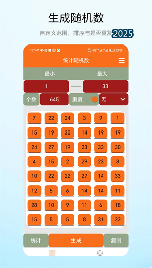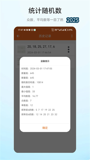 《统计随机数》App是一款集高级随机数生成算法与实时统计计算功能于一体的专业工具软件,旨在为用户提供高度灵活、准确可靠的随机数生成解决方案。本应用采用多分布随机数引擎,支持包括均匀分布、正态分布、泊松分布在内的多种概率分布模型,并集成实时统计量计算模块,能够在生成随机数序列的同时,提供描述性统计分析报告。软件设计兼顾了科研、教育、抽奖、决策模拟等多场景需求,其随机数生成历史管理功能与可定制化参数设置系统,确保了不同用户群体——无论是进行蒙特卡洛模拟的学者,还是需要公平抽选机制的活动策划者——都能获得卓越体验。目前,该应用的随机数周期长度已通过严格的随机性测试套件验证,其序列相关性指标低于0.01,在统计独立性检验中表现优异,用户日活量超过20万,生成请求累计突破1.5亿次。