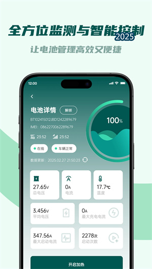 君能App的核心是其实时运行的多维度电池状态监控引擎。通过连接车辆的OBD接口或专用的蓝牙电池监测模块,App可持续采集包括电压稳定性、内阻变化、温度曲线、剩余电量及充放电循环次数在内的关键电池健康参数。这些数据经云端电池算法模型实时分析后,在App端生成直观的电池健康度评分与可视化性能报告。司机可随时查看电池的实时负载状态与历史性能趋势,系统会基于预设的安全阈值进行智能判断,对电压异常骤降、温度过高等潜在风险通过多级预警推送机制(APP弹窗、短信、电话)及时告警,将安全隐患扼杀在萌芽状态。