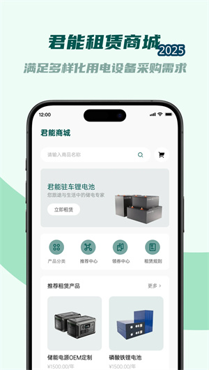 针对电池更换成本高昂、临时需求迫切的痛点,君能App内置了功能完善的B2C电池租赁垂直电商平台。商城内汇集了覆盖市面上主流商用车品牌与型号的高适配性租赁电池产品,每款电池都配有详细的规格参数说明、适用车型清单、租赁价格方案及用户评价。司机通过 “车型智能匹配”功能或手动筛选,可快速找到最适合自己车辆的租赁电池选项。租赁流程高度数字化,支持在线信用免押租赁、灵活租期选择、预约配送安装及电子合同签署。当租赁期满或司机决定购买新电池时,可通过电池回收估值功能获得旧电池残值评估与回收服务,实现电池资产的闭环管理。