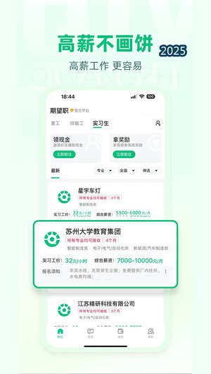 期望职开辟了独立的实习生招聘专区,汇聚众多知名企业与大型工厂提供的高薪实习岗位,涵盖生产见习、技术助理、管理培训等多种类型。平台为实习生提供岗位匹配推荐、实习协议指导、权益保障咨询等一站式服务。企业可发布详细的实习计划方案,包括实习周期安排、培训内容大纲、导师配备情况及转正机会说明。系统设有实习反馈机制,实习生完成阶段性任务后可提交实习报告,企业则提供表现评价,双向互动数据纳入双方的信用评价体系,为后续就业提供参考依据。