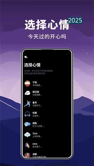 月亮山APP的核心功能是其极具引导性的睡前日记记录流程。流程始于 “选择心情” 模块,系统会以温柔的口吻询问 “今天过的开心吗” ,并提供一系列细腻的情绪图标(如明媚、平和、微澜、雨雾)供用户点选,快速锚定当日情感基调。接着进入 “写点东西” 模块,这里并非一片空白的文档,而是提供了多个启发性的引导性问题与开场白,如“今天最想感谢的一件事是?”、“一句对自己说的悄悄话”,帮助用户打破“不知道写什么”的障碍,自然地记录生活状态与新鲜事。这种引导式书写能有效降低记录门槛,让表达更顺畅。
