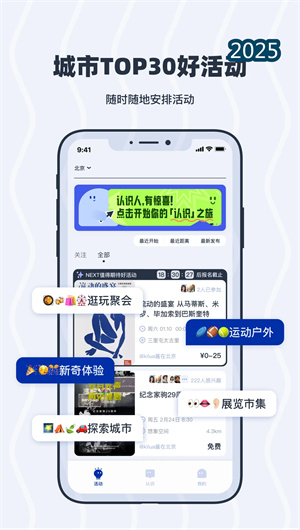 认识APP的 “城市TOP30好活动” 模块,是一个由编辑团队与算法共同驱动的城市生活精选引擎。每周,平台会从海量的城市活动中,依据热度、口碑、新奇度及用户偏好,筛选并推荐不同维度的TOP榜单,如 “本周必看展览市集”、 “周末运动户外精选”、 “小众新奇体验指南” 等。用户可以根据活动类型、时间、地点及兴趣标签进行筛选,探索城市生活的无限可能。平台的智能推荐系统会持续学习用户对活动的浏览、收藏、参与行为,在首页信息流中推送更符合其口味的个性化活动内容,从大型逛玩聚会到深度文化体验,帮助用户高效决策,告别选择困难。