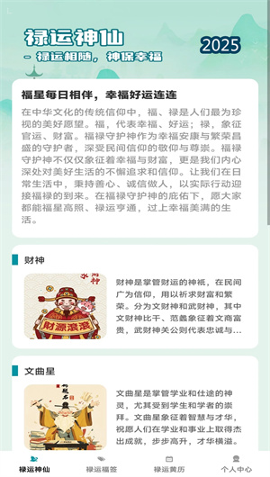 禄运连连APP的核心功能之一是其精心构建的 “禄运神仙”数字文化知识库。该模块深度系统地介绍中国传统文化中广为人知的神仙谱系,如掌管财富的文武财神、主司功名文昌的文曲星君、象征健康长寿的南极仙翁以及庇佑姻缘的月下老人等。对每位神仙的呈现不仅包含精美的传统神像绘画,更详尽阐述其在民间传说中的起源故事、神话体系中的角色定位以及所承载的文化象征意义。例如,在介绍财神赵公明时,会解析其形象特征(黑面浓须、骑黑虎、持金鞭)的寓意,及其在道教信仰与年俗文化中的重要地位。模块还配有知识问答与收集图鉴等互动环节,让用户在趣味学习中加深对传统文化的理解与认同。