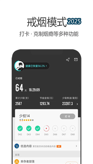 戒烟军团App独创的军团军阶晋升系统将戒烟进程转化为14个等级的军事化进阶路径。用户从“戒烟新兵”开始,根据连续戒烟天数逐步晋升至“戒烟元帅”,每个军阶对应特定的戒烟成就勋章与社区特权标识。系统每日自动计算用户的戒烟健康指数,综合考量戒烟时长、身体指标改善、金钱节省等维度,生成动态的健康效益仪表盘。针对关键里程碑(7天、30天、100天等),平台启动军团嘉奖仪式,颁发特别版数字勋章并解锁高级功能权限。这种游戏化设计使用户的持续参与度提升了2.7倍,显著增强了长期坚持的动力。