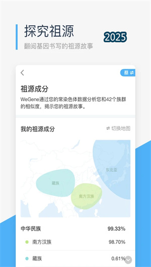用户登录微基因APP后,即可进入个人基因组数据看板,其核心为涵盖12大类的结构化报告体系。每份报告,如健康风险预测或营养代谢评估,均基于严格的循证医学等级系统,并提供详细的风险等位基因说明与人群频率对比数据。平台采用先进的交互式基因组浏览器,允许用户直观探索特定基因位点(如APOE基因与阿尔茨海默症风险关联),并通过多图层信息叠加功能,将祖源成分分析与历史迁徙路径相结合,生动描绘生命源流图谱。