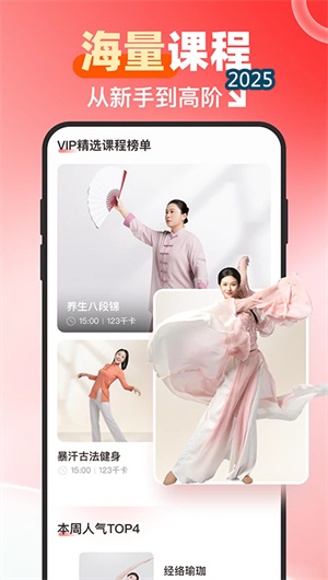针对零基础用户最大的畏难心理,元气伸展的课程设计体现了极高的教学设计智慧。所有课程均从最基础的 “功法预备式教学” 、 “呼吸入门指导” 开始,采用 “单式分解-组合串联-完整跟练” 的三段式教学法。例如,学习八段锦时,会先单独精讲“双手攀足固肾腰”的每一个细节,再将其融入小组合,最后进行全套跟练。这种设计确保了用户无需任何前置知识即可轻松入门,并随着计划推进,自然而然地实现从“模仿外形”到“体会内劲”的技能进阶,学习曲线平缓而有效。