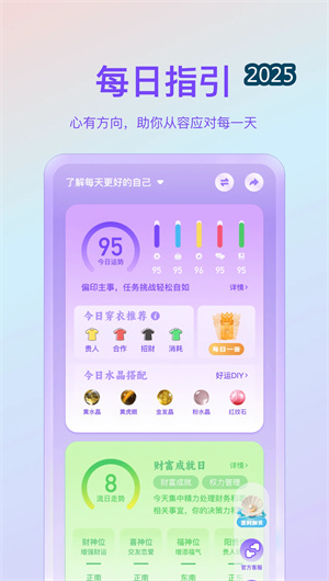 1. 平台核心的 “多维每日指引引擎” 基于传统五行生克理论与用户注册信息,每日动态生成个性化的生活行动建议。系统通过时空能量计算模型,结合当日天干地支、节气转换及个人五行属性,在健康、情感、事业、财运等维度提供微时机提示。指引内容融合现代美学设计,以精美的卡片与温和的语言呈现,旨在帮助用户在快节奏生活中把握容易被忽略的 “细微好时机”,实现传统智慧对日常生活的轻量级渗透与正向引导。