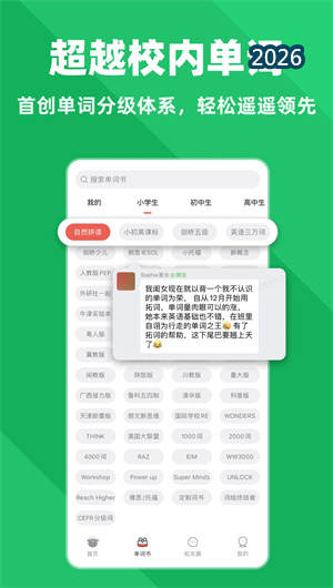拓词的核心功能是其庞大而系统的海量词库与智能的学习路径规划引擎。词库全面覆盖课本同步单词(从小学到高中、国际学校)、考试官方单词(涵盖剑少、剑桥五级、小托福、托福、雅思等),并支持用户自建专属单词书以满足个性化需求。更重要的是,用户在选择学习内容后,系统会基于其设定的目标(如备战某考试、提升学期成绩)和初始水平评估,在独创的「中小学生分级单词体系」框架下,自动生成一条从1级起步到5级飞跃的渐进式学习路径。这条路径明确了每个阶段的核心训练模式(如拼读训练或释义训练)与目标词汇量,确保学习过程科学、有序、可衡量。