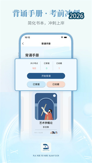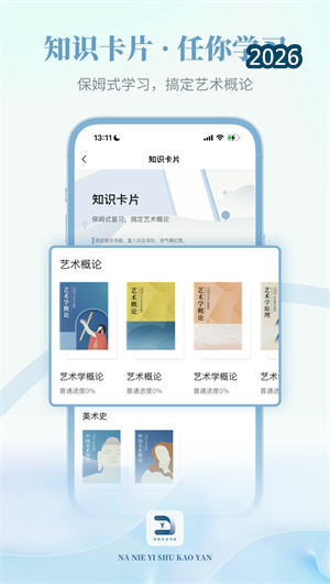 本功能的核心在于将庞杂的艺术理论转化为可轻松掌控的模块。软件内置超过 9套知识卡片,这些卡片并非简单罗列,而是严格对标各大院校艺术概论考纲,经由考点拆解与逻辑重构而成。每一张卡片均包含核心概念、延伸解析与关联考点,用户可通过卡片翻转、要点高亮等功能进行互动学习。结合独创的 “一步高效背诵法则” ,系统能根据艾宾浩斯记忆曲线智能推送复习卡片,实现 “逐步精简循序渐进” 的记忆强化过程,确保知识点从短期记忆顺利转入长期记忆,极大提升了记忆的牢固度与提取速度。