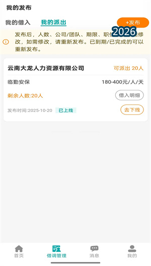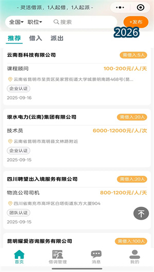 旁达借调APP配备多维匹配算法,支持借出与借入双端需求精准对接。借出方发布闲余人员信息(人数/技能/可借出时段/期望薪酬),借入方发布急需岗位描述(工种/人数/工作地点/工期),系统通过技能标签、地理位置、时间匹配度等维度计算推荐指数,自动推送最合适的交易对象。独创抢单模式——借入方发布急单后,借出方可实时抢单,平台根据信用分排序推荐成交。
