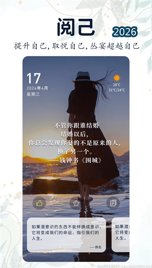 阅己APP是一款专注于情感化短句与极简视觉美学的轻阅读心灵陪伴工具,通过精选句子库与每日图文匹配的双核驱动,构建覆盖严肃哲思、励志能量、唯美意境、心动瞬间及伤感独白的情绪共鸣空间。平台以“愿你每天遇到一句赏心的话,一幅悦目的图”为哲学,用精简交互与干净UI过滤信息噪音,让用户在碎片时间里与真实的自己对话。目前累计收录精选句子37万条,每日更新图文卡片24张,服务用户超147万人,日均打开率67%,被用户称为“手机里的心灵氧吧”。
