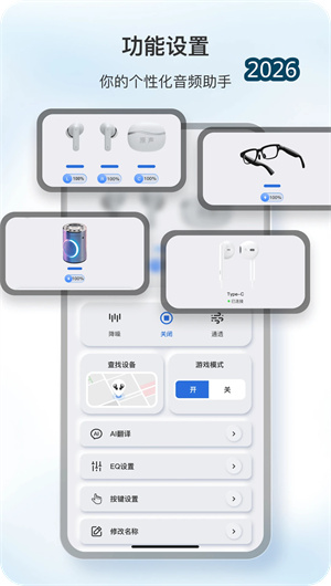 1. 深度集成的耳机控制系统: 该模块将入耳式耳机、头戴式耳机乃至骨传导耳机的硬件潜力发挥到极致。用户不仅可以在App内实时查看耳机舱及左右耳机的独立电量显示,还能针对不同频响曲线的耳机进行精细化的EQ调节。系统内置了从古典乐到电子乐的多种预设音效,更支持用户根据听音偏好手动调整均衡器的各个频段。同时,针对支持主动降噪功能的耳机,原声提供了多档位的通透模式和降噪深度调节,并能对耳机的触控面板进行个性化的按键设置,无论是双击、长按还是滑动,都可以自定义为播放控制、唤醒语音助手或切换降噪模式,真正实现了“耳机支持的我都可以有”。