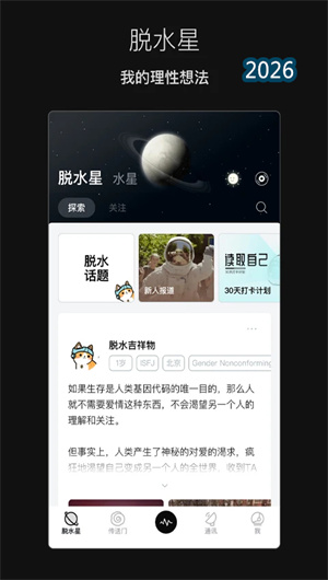 1. 脱水星:思考者的篝火广场: 脱水星是专为理性表达设计的空间。在这里,用户可以记录每日的思考、自省、疑惑、洞见。每条内容都以简洁的卡片形式呈现,没有点赞数的压力,没有评论区的喧嚣,只有纯粹的思想记录。用户可以为自己打上思考标签,如“哲学”、“科技”、“人生”、“读书”等,方便找到同频的思考者。在篝火广场,你可以看到其他用户的思考碎片,如果产生共鸣,可以“点火”(类似收藏)或留下安静的评论。这种去中心化的思考分享,让脱水星成为喧嚣时代的一片思想净土。