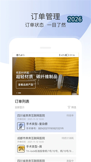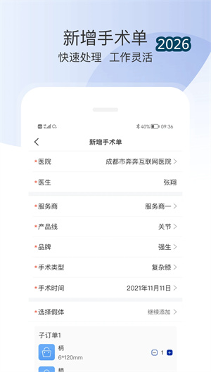 总之,奔奔跟台App以其对骨科行业的深刻理解和对政策趋势的精准把握,为用户提供了一个集线上派单、物流跟踪、库存优化、数据查询于一体的全方位手术服务协同平台。它让厂家销售团队更加聚焦节约成本,让物流平台库存优化备货精准,让经销商订单有保证随时掌握用量,让跟台员手机下单操作简便跟台统计方便结算。现在就加入奔奔跟台的500家品牌商、2000家经销商、5万名跟台员行列,开启你的骨科高效管理之旅——在这里,响应国家带量采购政策,实现供应链属地化管理,提供数据追溯服务,重构合法服务证据链。