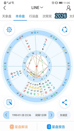 1. 专业星盘生成工具: 若道的核心功能之一是专业的星盘生成工具。用户只需输入出生日期、出生时间、出生地点,系统即可精准生成个人星盘。星盘包含行星位置、星座分布、宫位划分、相位关系等核心信息。生成的星盘可以保存在个人账号中,随时查看。用户可以调整宫位制(如普拉西度制、等宫制)、星座系统(热带星座、恒星星座),满足不同占星流派的计算需求。星盘可以分享给朋友或占星师,也可以导出为图片保存。这种专业工具,让占星爱好者无需手动计算,轻松获得精准星盘。