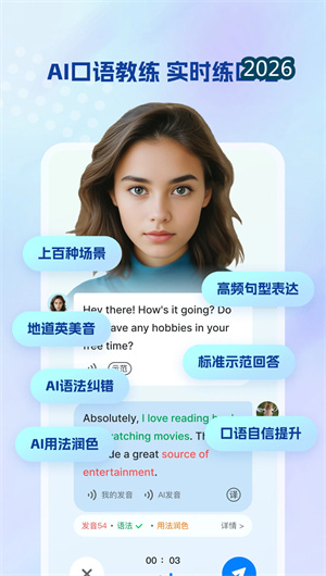 1. AI口语教练与多场景练习: 可可英语的AI口语教练功能让口语练习变得随时可行。用户可以选择多场景对话主题,如日常会话、商务沟通、旅行英语、面试英语等,与智能AI进行真实对话练习。AI会实时进行语音打分,从发音准确度、流利度、完整度等多个维度评估;同时提供语法纠错,指出表达中的语法问题并给出修改建议。这种智能陪练,让用户无需高价外教也能高效提升口语。
