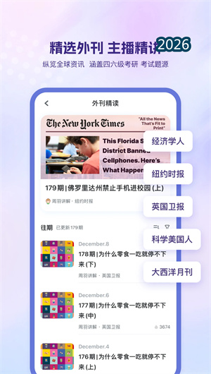 3. 外刊精读与名著精讲: 可可英语的外刊精读功能精选新鲜外刊资讯,由主播带领用户精读看世界。每篇文章都有双语对照、重点词汇、长难句解析、背景知识拓展。名著精讲精选国外原版名著,如《小王子》、《老人与海》、《傲慢与偏见》等,带用户精听细读,感受文化魅力。这种阅读拓展,让用户在提升英语的同时开阔视野。