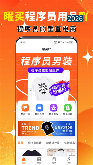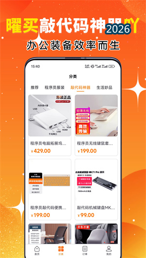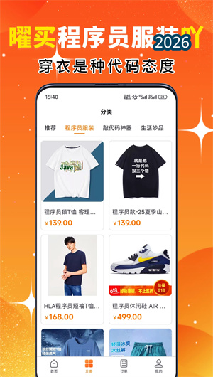 1. 曜买吖的“程序员服装与敲代码装备”功能,专为编码奋战者设计,提供兼具极客精神的T恤、卫衣和高效办公装备如机械键盘、人体工学椅。在程序员专区,穿衣是种代码态度,装备为效率而生。这一功能已帮助90%的用户提升工作舒适度,日均装备销量超10万件,满意度达94%。