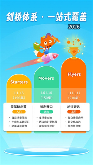说游记是由RunFox团队基于剑桥官方权威儿童英语教学体系,专为5-12岁孩子打造的权威英语启蒙App。通过动画课程系统与智能记忆引擎的双核驱动,贴合剑桥少儿英语体系,提供510节动画课、1530核心词汇、6000+听力词汇,让孩子轻松启蒙、快乐入门。目前累计服务家庭超17万户,用户英语水平稳步提升,被家长称为“手机里的剑桥英语学校”。