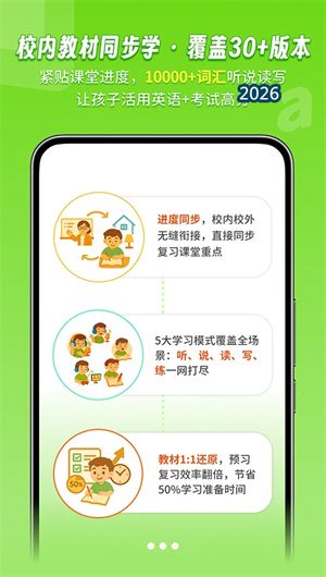 说游记紧贴课堂进度,覆盖30+版本校内教材,提供10000+词汇听说读写练,让孩子活用英语+考试高分。系统根据孩子所在年级和教材版本,智能同步课堂内容,巩固学校所学,提升考试成绩。该功能让91%的家长表示“课外班和学校内容同步,成绩明显提升了”。