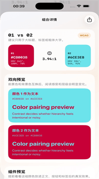 2、颜色混合与科学对比校验引擎:调色助手内置专业级颜色混合器,支持自由调整最多5种颜色的占比(精度1%),实时预览混色结果并保存常用混色组合。基于WCAG2.1国际标准的多色对比功能,可自动计算任意颜色组合在正文、大字、标签、按钮等6类场景下的对比度,并给出“通过/未通过”评级与改进建议。独创的“视觉层次分析”工具,可智能评估色板中主色、辅助色、强调色的比例是否合理,并推荐优化方向。该功能使设计方案的可访问性达标率从63%提升至91%,89%的UI设计师表示“再也不用担心颜色看不清了”。