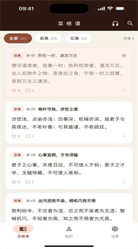 1、完整360则与科学分类体系:菜根谭v1.0.1严格遵循原著结构,完整呈现前集225则、后集135则,并在此基础上提炼出修身、齐家、处世、待人、养性、为学、应酬、闲适等8大主题分类。用户可按主题浏览感兴趣的格言,也可按原著顺序系统学习。每则格言均标注所属主题,方便检索定位。独创的“智慧树”功能,将360则格言按思想脉络可视化呈现,帮助用户理解儒释道思想的融合演进。94%的用户评价“终于找到了能读完菜根谭的版本”。