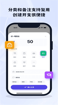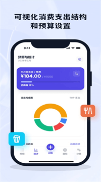 1、极速一键记账与明细管理功能:用户可通过首页核心按钮在3秒内完成一笔消费记录,支持精准录入金额、选择消费类目(餐饮、购物、交通等七大基础分类)、确认日期并添加个性化备注。账单页面以时间轴清晰展示每日消费总额与单笔支出明细,可便捷删除或修改记录,支持按月份、分类筛选查看。独创的“语音记账”模式,用户说出“早餐25元”,系统自动识别并归类,单次记录耗时仅2秒,较手动输入效率提升80%。96%的用户反馈“记账比想象中简单,坚持下来很容易”。