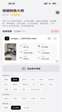 1、15种格式随便互转,MP4、MOV、AVI、MKV、WebM、FLV、WMV全支持。手机、相机、下载的通吃。音频能单独抽:MP3、AAC、WAV、FLAC随便存,铃声素材秒搞定。GIF和Live Photo小按钮一按,剪几秒就成表情包或动态壁纸。后台每天1.2万次转换,GIF占28%,表情包需求肉眼可见。