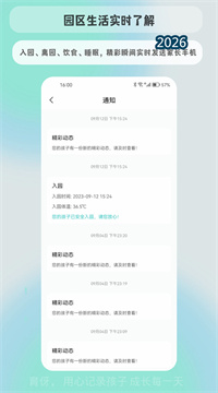 1. 入园+离园+健康+饮食+饮水+睡眠的六维数据推送:育伢最鲜明的特色在于其构建了入园、离园、健康、饮食、饮水、睡眠六个维度的全维度数据推送体系。入园与离园解决家长最基础的“孩子安全到了吗、平安离开了吗”的安心需求;健康解决“孩子今天身体怎么样”的关切需求;饮食与饮水解决“孩子吃得好吗、喝得够吗”的营养需求;睡眠解决“孩子休息得好吗”的健康需求。这六个维度覆盖了幼儿在园生活的核心场景,让家长从“不知道孩子在园怎么样”的焦虑中解放出来,转变为“如亲临现场般”的安心与信任。