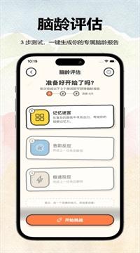 2. 脑龄评估:上线先跑数字记忆、反应、色彩 3 项基准测试,30 秒出报告,直接给你个“脑龄”数字和百分位排名,像体检单一样直观,一眼看懂自己排在 18 岁还是 81 岁区间。