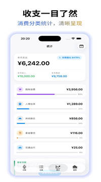 2、智能分类+统计图表,花钱花到哪一目了然:记完后,它会自动把“吃饭”“交通”“购物”分好类。打开统计页,能看到这周在吃上花了多少,这个月交通费占了多少,用饼图、柱状图显示。86%的用户觉得“以前不知道钱去哪了,现在一看就明白”。