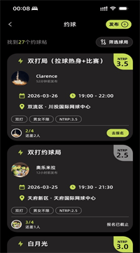2、AI根据你的水平标签推送同城球友,一键发起「拼场」或「单挑」,到点自动提醒。