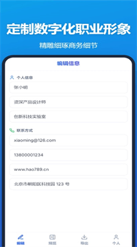 电子名片制作是一款把纸质名片秒变电子档的轻量工具,信息一次录入就能到处通用,手机轻点几下搞定商务社交